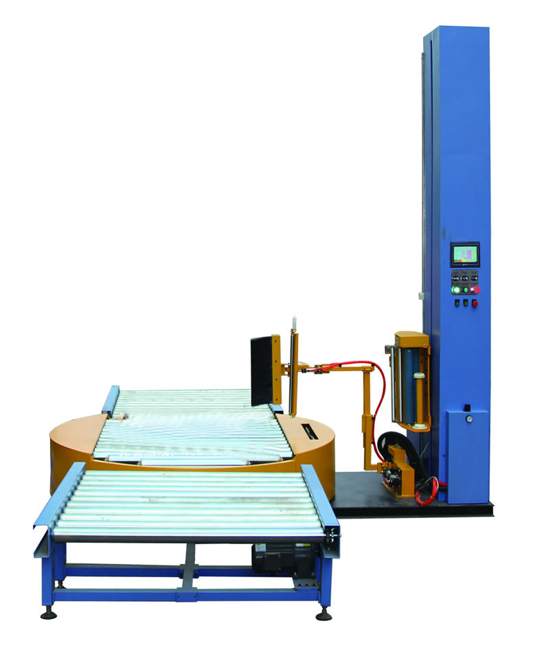 將待包裝物體通過輥道輸送至本設備平行托起運送至轉盤中心位置,打開啟動按鈕,機器自動按設定程序包裝物體,完成后自動停止。